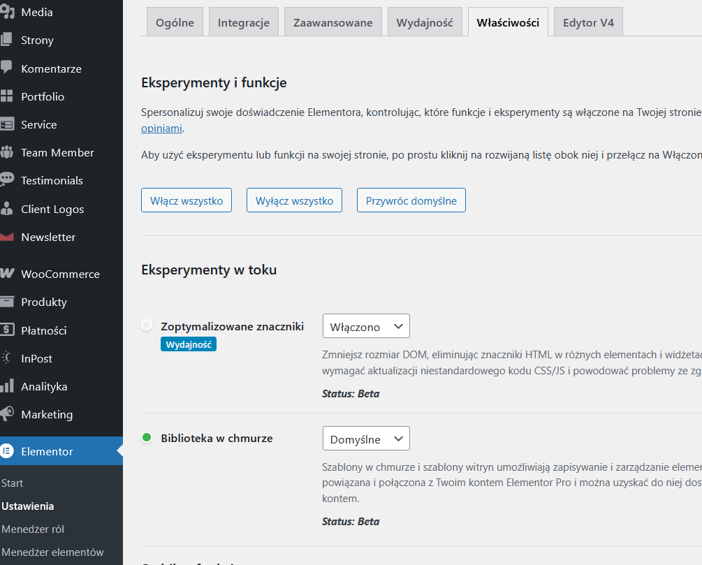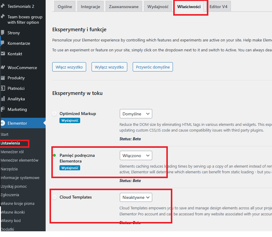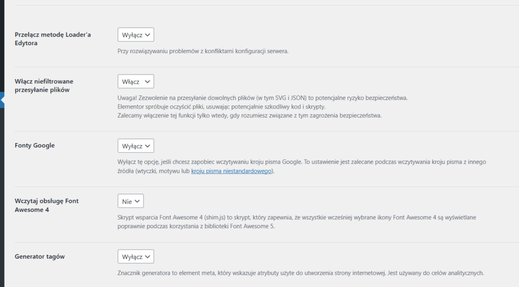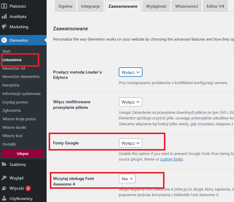 Elementor > Ustawienia > Zaawansowane