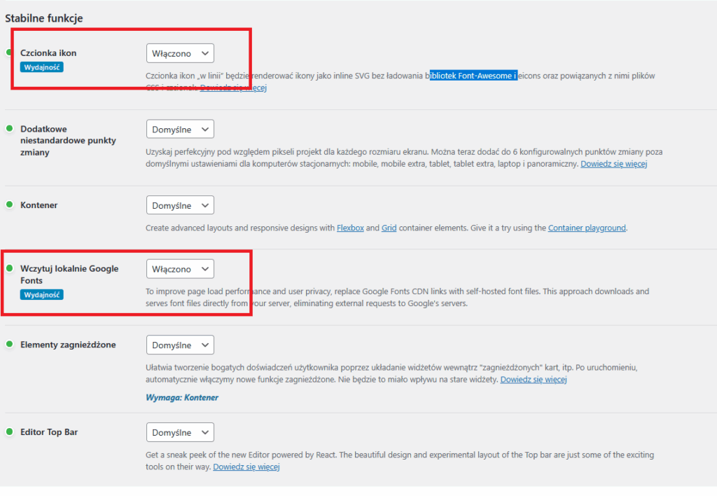 - wykorzystywanie lokalnej czcionki dodanej w szablonie i wyłączenie ładowania czcionek Google (w przypadku elementora pro można załadować własną czcionkę korzystając z ich opcji)