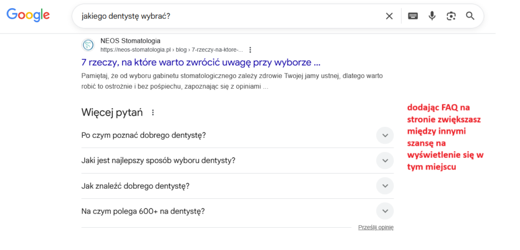 Sekcja pytań i odpowiedzi na stronie prawidłowo otagowana dla robotów (za pomocą tak zwanego schema.org przekazywanego w javascripcie) będzie mogła wyświetlić się w samym Google lub zasilić wachlarz odpowiedzi – gotowców dla chatów.