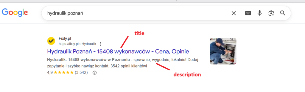 Każda strona internetowa oprócz tego co widzi klient posiada dane dla robotów. Takimi podstawowymi danymi przekazywanymi chociażby Google’owi są title (tytuł strony) i description (opis – krótka informacja o zawartości podstrony). Powinieneś wyposażać je w słowa kluczowe, pamiętając o zasadzie: slowa bardziej z przodu będą lepiej premiowane.
