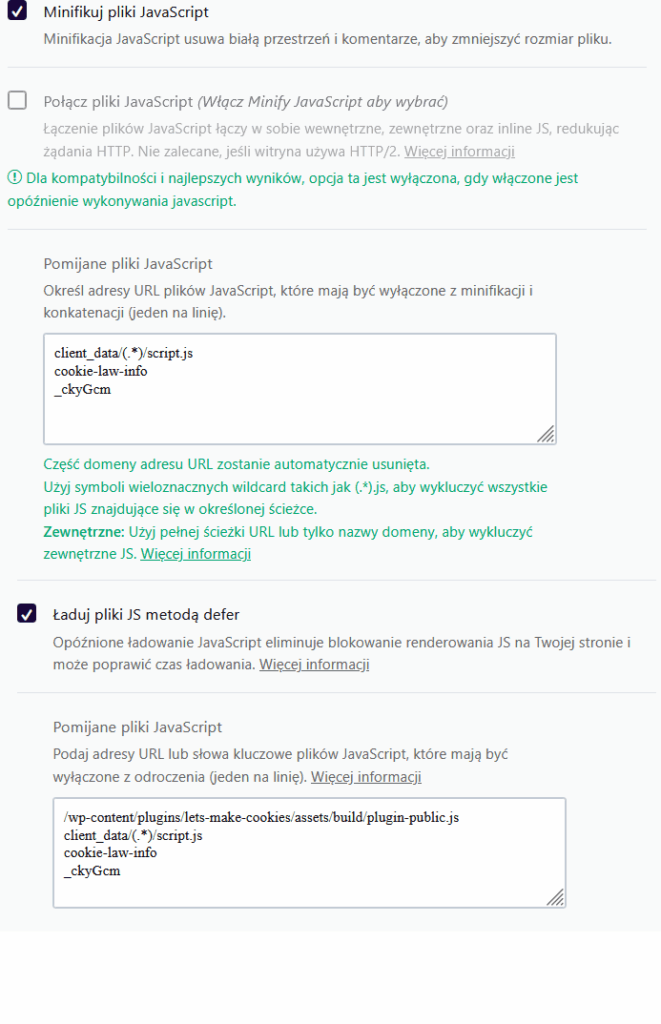 Te same ścieżki należy wykluczyć w opcji „Load javascript deferred” oraz jako wyjątek w „delay javascript execution”